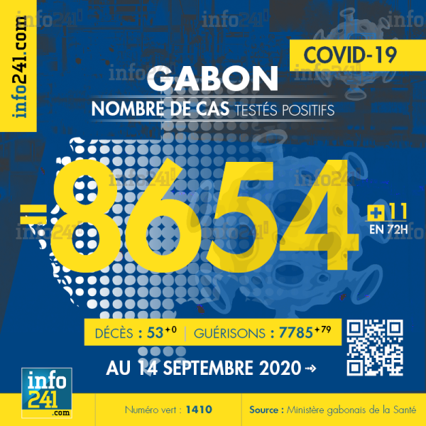 Ce qui porte le bilan à 8 654 cas confirmés, 53 décès et 7 785 guérisons. Le Gabon compte actuellement 816 cas actifs de la pandémie officiellement déclarés. Parmi eux 5(+0) patients hospitalisés dans le pays dont 0(+0) en réanimation.