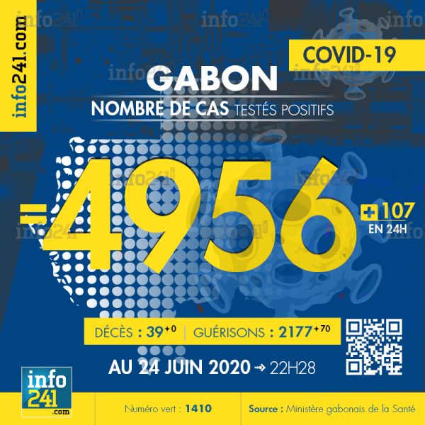Bilan épidémiologique du Gabon au 24 juin 2020 : 107 nouveaux cas enregistrés en 24h dans l’Estuaire (102 cas) et le Moyen-Ogooué (5 cas). Il y a eu aucun nouveau décès et 70 nouvelles guérisons. Ce qui porte le bilan à 4 956 cas confirmés, 39 décès et 2 177 guérisons. Il y a actuellement 69(+13) patients hospitalisés dans le pays dont 12 (+4) en réanimation.