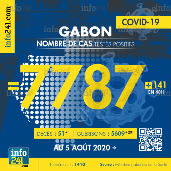 Ce qui porte le bilan à 7 787 cas confirmés, 51 décès et 5 609 guérisons. Le Gabon compte actuellement 2 127 cas actifs de la pandémie officiellement déclarés. Parmi eux 27(+0) patients hospitalisés dans le pays dont 4(+0) en réanimation.