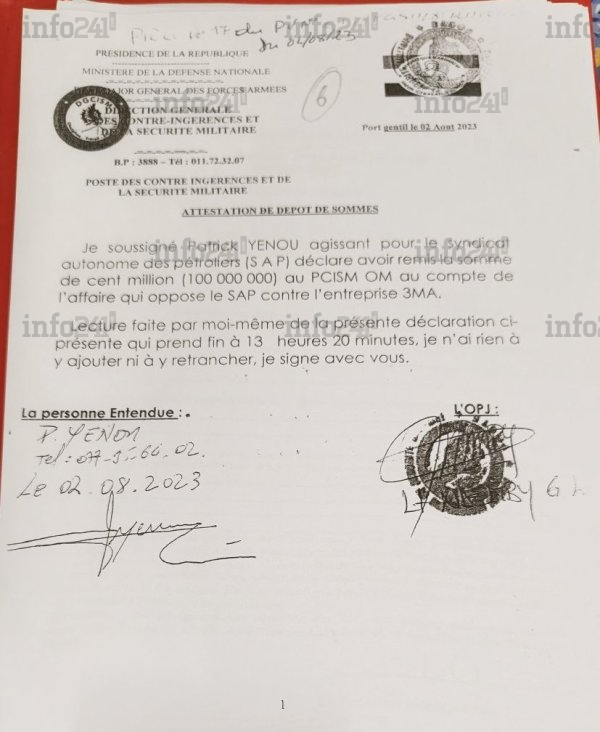 Patrick Yenou, en tant que responsable syndical, est convoqué en septembre 2023 par la Direction générale des contre-ingérences et de la sécurité militaire (DGCISM alias B2), sur instruction du parquet. Selon lui, des pressions et menaces sont exercées par un officier, le lieutenant G. L. Ndemby, qui exige 150 millions de francs CFA pour sa libération. Après négociation, Yenou affirme avoir été contraint de verser 100 millions, remis au B2 sous forme d’espèces et de chèque bancaire, contre un reçu officiel. L’affaire est ensuite classée sans suite.