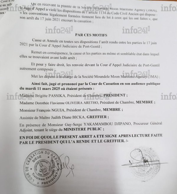 Le 11 mars 2025, la Cour de cassation annule l’arrêt rendu contre le SAP, relevant une violation de l’article 1134 de l’ancien Code civil. L’affaire est renvoyée devant la cour judiciaire de Port-Gentil autrement composée. Le 13 août 2025, cette dernière blanchit totalement le SAP et condamne 3MA.