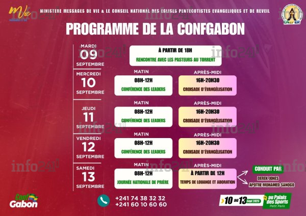 Depuis ce mardi et jusqu’au 13 septembre, Libreville abrite la ConfGabon, une conférence des leaders et croisade initiée par l’apôtre Mohamed Sanogo, figure spirituelle influente sur le continent africain. Placé sous le thème « Pour l’amour du Gabon » (Ésaïe 62:1), l’événement entend conjuguer enseignements bibliques, actions sociales et temps de prière pour bénir la nation gabonaise.