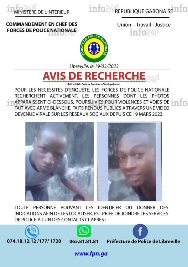 Des faits passibles de poursuites judiciaires. D’où l’avis de recherche de la police gabonaise. « Toute personne pouvant les identifier ou donner des indications afin de les localiser, est priée de contacter les services de police », conclu l’avis de recherche. Des services joignables sur WhatsApp au 065 81 81 81 et par appel au 074 18 12 12.