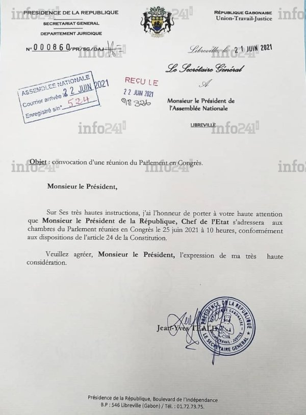 Portant comme objet la “convocation d’une réunion du parlement”, la brève note en question adressée aux deux chambres du parlement et dont copie nous est parvenue dit intégralement ceci : « Sur ses très hautes instructions, j’ai l’honneur de porter à votre attention que Monsieur le Président de la République, Chef de l’État s’adressera aux chambres du parlement réunies en Congrès le 25 juin 2021, conformément aux dispositions de l’article 24 de la constitution. Veuillez agréer, Monsieur le Président, l’expression de ma très haute considération ».
