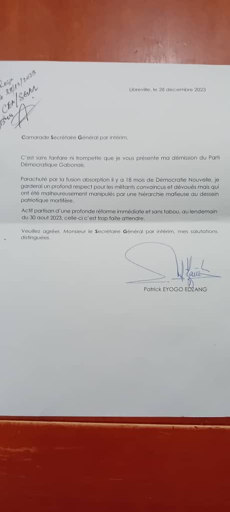 Le Parti démocratique gabonais (PDG) d’Ali Bongo chassé du pouvoir l’armée gabonaise vit ses heures les plus troubles. La faillite politique de l’ancien parti unique se confirme de plus en plus avec les démissions en cascade de ses anciens militants. Ce jeudi 28 décembre le tour est revenu à l’ancien ministre de l’Energie, Patrick Karim Eyogo Edzang, par ailleurs secrétaire général adjoint 5 chargé des relations avec les partenaires politiques.