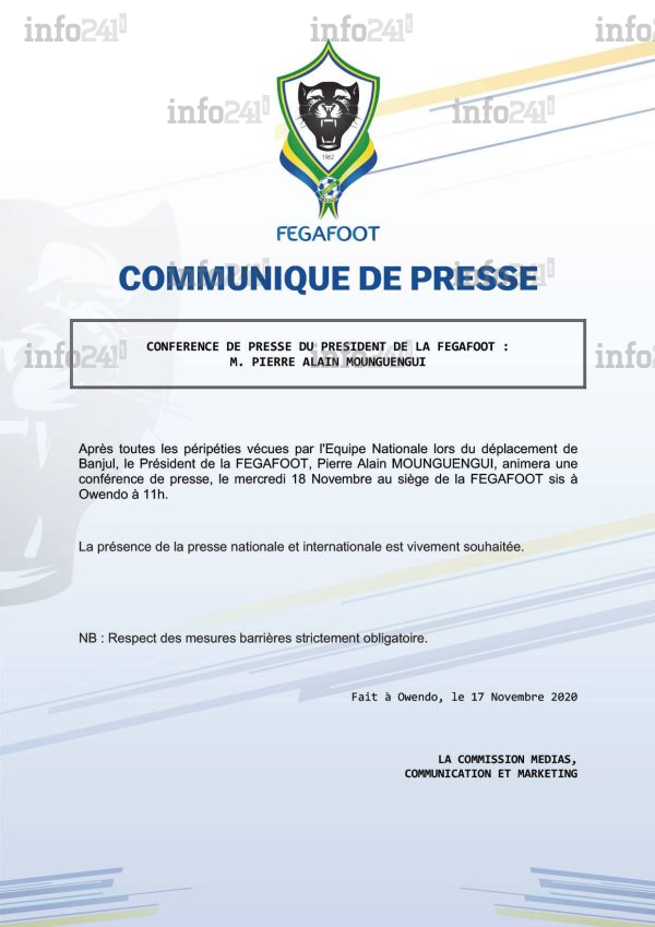 « Après toutes les péripéties vécues par l’équipe nationale lors du déplacement de Banjul, le président de la Fegafoot, Pierre Alain Mounguengui, animera une conférence de presse, le mercredi 18 novembre au siège de la Fegafoot sis à Owendo à 11h », martèle le communiqué de la commission médias, communication, marketing de la Fegafoot.
