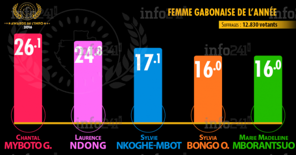 Chantal Myboto Gondjout a été sacrée par le vote des internautes gabonais, prix de la Femme gabonaise de l’année 2016, avec 28.10% des votes exprimés sur 12. 830 votants. La lauréate a été préférée à 4 autres personnalités que sont : Laurence Ndong, 24.80%, Sylvie Nkoghe-Mbot, 17.10%, Marie Madeleine Mborantsuo, Sylvia Bongo Ondimba ont récolté les deux 16% des voix.