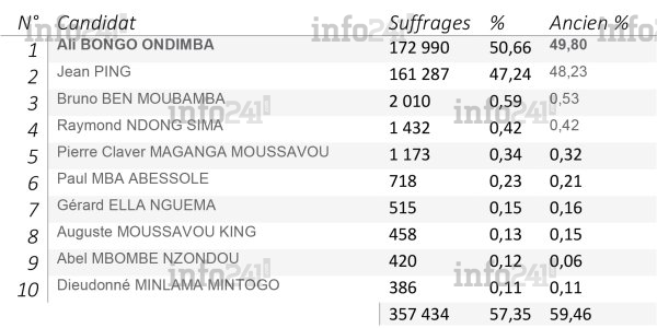 Bilan de ces réajustements qui ne manqueront pas de faire réagir les électeurs gabonais qui se sentiront floués, Ali Bongo est déclaré vainqueur du scrutin avec 50,66% contre les 49,80% du ministre de l’Intérieur. Son rival Jean Ping est désormais crédité de 47,14% des suffrages contre 48,25% précédemment. Un diète juridique qui profite grandement au candidat du Parti démocratique gabonais (PDG, au pouvoir depuis 1968).