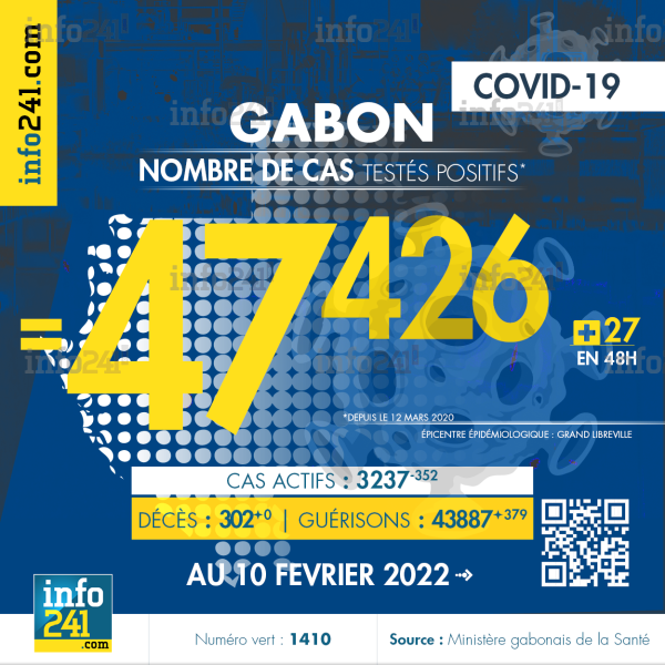 Bilan épidémiologique du Gabon au 10 février 2022 : 27 nouveaux cas enregistrés en 48h dans l’Estuaire (24 cas) et l’Ogooué-Maritime (3 cas). Il y a eu aucun nouveau décès et 379 nouvelles guérisons.