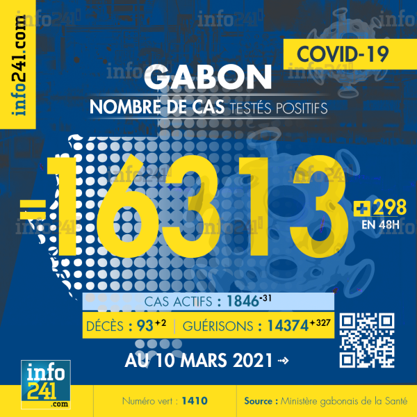 Bilan épidémiologique du Gabon au 10 mars 2021 : 298 nouveaux cas enregistrés en 48h dans l’Estuaire (198 cas), le Haut-Ogooué (41 cas), l’Ogooué-Maritime (29 cas), le Moyen-Ogooué (9 cas), l’Ogooué-Ivindo (7 cas), l’Ogooué-Lolo (7 cas), le Woleu-Ntem (4 cas) et la Nyanga (3 cas). Il y a eu 2 nouveaux décès et 327 nouvelles guérisons.