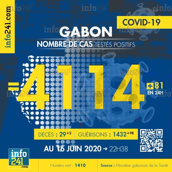 Le bilan épidémiologique du Gabon au 16 juin 2020 : 81 nouveaux cas enregistrés en 24h dans l’Estuaire. Il y a eu 2 nouveaux décès au CHU de Libreville et 98 nouvelles guérisons. Ce qui porte le bilan à 4 114 cas confirmés, 29 décès et 1 432 guérisons. Il y a actuellement 107(+11) patients hospitalisés dans le pays dont 15 (+0) en réanimation.