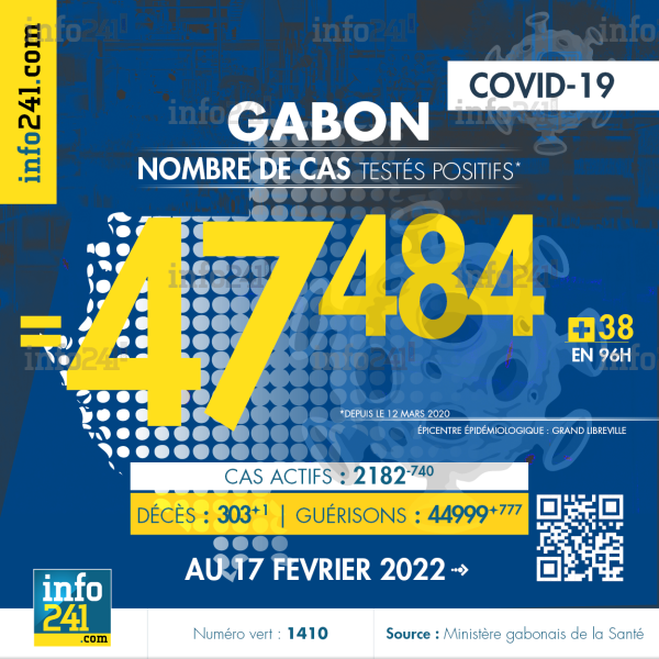 Bilan épidémiologique du Gabon au 17 février 2022 : 38 nouveaux cas enregistrés en 96h dans la Ngounié (16 cas), l’Estuaire (13 cas) et l’Ogooué-Maritime (9 cas). Il y a eu un nouveau décès et 777 nouvelles guérisons.