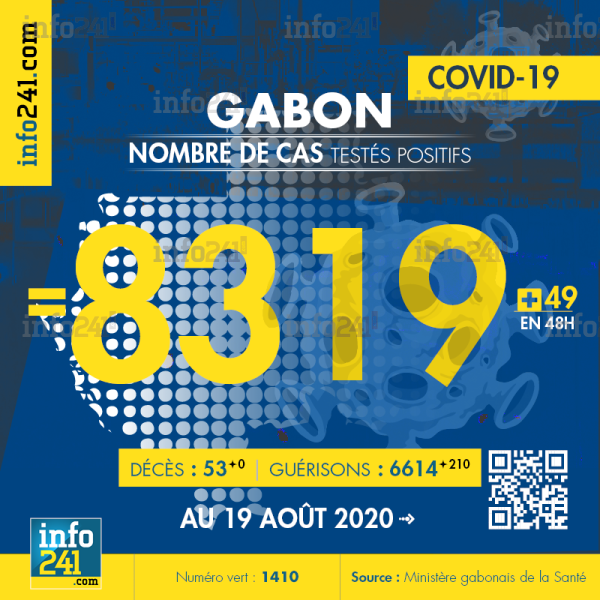 Ce qui porte le bilan à 8 319 cas confirmés, 53 décès et 6 614 guérisons. Le Gabon compte actuellement 2 106 cas actifs de la pandémie officiellement déclarés. Parmi eux 31(+1) patients hospitalisés dans le pays dont 2(+0) en réanimation.