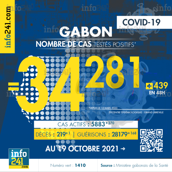 Bilan épidémiologique du Gabon au 19 octobre 2021 : 439 nouveaux cas enregistrés en 48h dans l’Estuaire (391 cas), l’Ogooué-Maritime (25 cas), le Woleu-Ntem (6 cas), le Haut-Ogooué (6 cas), la Ngounié (4 cas), le Moyen-Ogooué (3 cas), l’Ogooué6ivindo (3 cas) et la Nyanga (1 cas). Il y a eu 1 nouveau décès et 168 nouvelles guérisons.