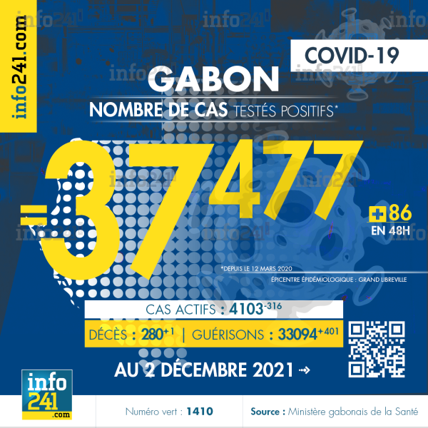 bilan épidémiologique du Gabon au 2 décembre 2021 : 86 nouveaux cas enregistrés en 48h dans l’Estuaire (45 cas), l’Ogooué-Maritime (31 cas), la Nyanga (4 cas), le Haut-Ogooué (2 cas), le Moyen-Ogooué (2 cas), la Ngounié (1 cas) et l’Ogooué-Ivindo (1 cas). Il y a eu un nouveau décès et 401 nouvelles guérisons.