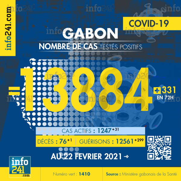 Ce qui porte le bilan à 13 884 cas confirmés, 76 décès et 12 561 guérisons. Le Gabon compte actuellement 1 247(+31) cas actifs de la pandémie officiellement déclarés. Parmi eux 77(+3) patients hospitalisés dans le pays dont 15(-5) en réanimation.