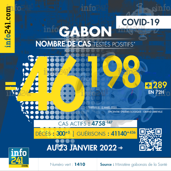 Bilan épidémiologique du Gabon au 23 janvier 2022 : 289 nouveaux cas enregistrés en 72h dans l’Ogooué-Maritime (180 cas), l’Estuaire (107 cas), la Ngounié (1 cas) et le Woleu-Ntem (1 cas). Il y a eu aucun nouveau décès et 436 nouvelles guérisons.