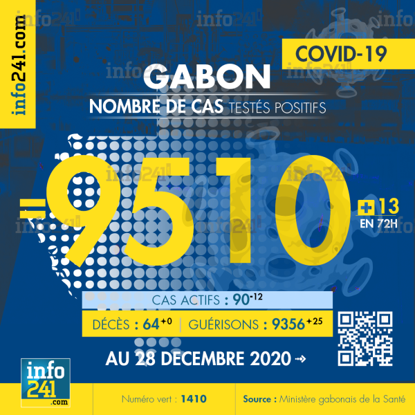 Ce qui porte le bilan à 9 510 cas confirmés, 64 décès et 9 356 guérisons. Le Gabon compte actuellement 90(-12) cas actifs de la pandémie officiellement déclarés. Parmi eux 3(-0) patients hospitalisés dans le pays dont 3(-0) en réanimation.