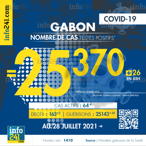 Ce qui porte le bilan à 25 370 cas confirmés, 163 décès et 25 143 guérisons. Le Gabon compte actuellement 64 (-4) cas actifs de la pandémie officiellement déclarés. Parmi eux 14 (+2) patients hospitalisés dans le pays dont 8 (+4) en réanimation.