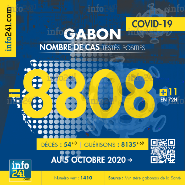 Bilan épidémiologique du Gabon au 5 octobre 2020 : 11 nouveaux cas enregistrés en 72h dans l’Estuaire (10 cas) et l’Ogooué-Maritime (1 cas). Il y a eu aucun nouveau décès et 68 nouvelles guérisons.