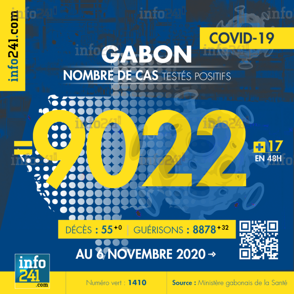 Bilan épidémiologique du Gabon au 6 novembre 2020 : 17 nouveaux cas enregistrés en 48h dans l’Estuaire (13 cas) et l’Ogooué-Maritime (4 cas). Il y a eu aucun nouveau décès et 32 nouvelles guérisons.