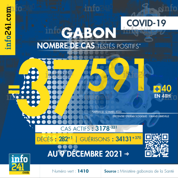 Bilan épidémiologique du Gabon au 9 décembre 2021 : 40 nouveaux cas enregistrés en 48h dans l’Estuaire (31 cas), le Moyen-Ogooué (5 cas) et le Haut-Ogooué (4 cas). Il y a eu un nouveau décès et 370 nouvelles guérisons.