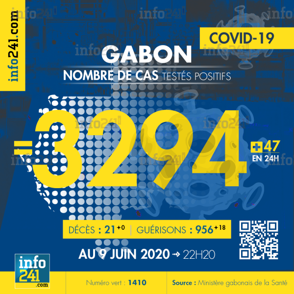Coronavirus : le bilan épidémiologique du Gabon au 9 juin 2020 : 47 nouveaux cas enregistrés en 24h dans l’Estuaire (45 cas) et le Moyen-Ogooué (2 cas). Il y a eu aucun nouveau décès et 18 nouvelles guérisons. Ce qui porte le bilan à 3 294 cas confirmés, 21 décès et 956 guérisons. Il y a actuellement 87(-25) patients hospitalisés dans le pays dont 15 (-3) en réanimation.