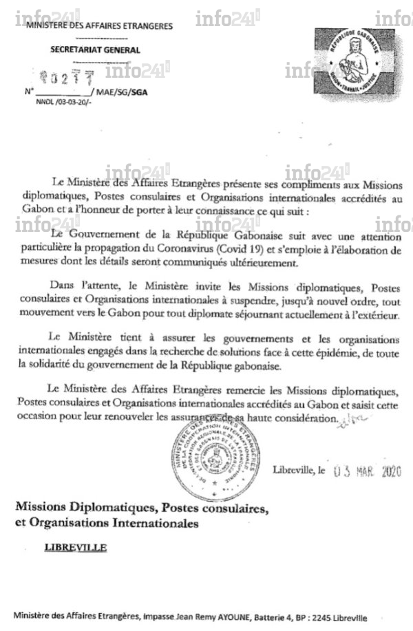 Coronavirus : le Gabon invite les diplomates à suspendre « tout mouvement vers le Gabon » © 2020 D.R./Info241
