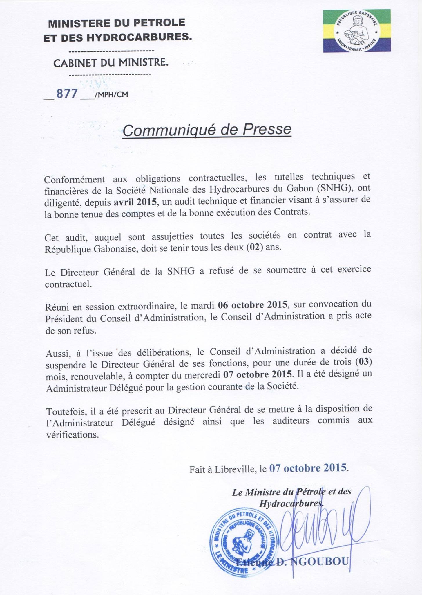 Que se passe t-il donc au sein de l’entreprise nationale créé en 2011 par Ali Bongo ? Pourquoi son directeur général se refuse à un audit en vue pourtant de « s’assurer de la bonne tenue des comptes et de l’exécution des contrats » ? L’audit ayant été initié depuis avril 2015 dans l’entreprise, pourquoi avoir attendu octobre 2015 pour prendre des mesures à l’encontre de l’insoumis directeur général ?