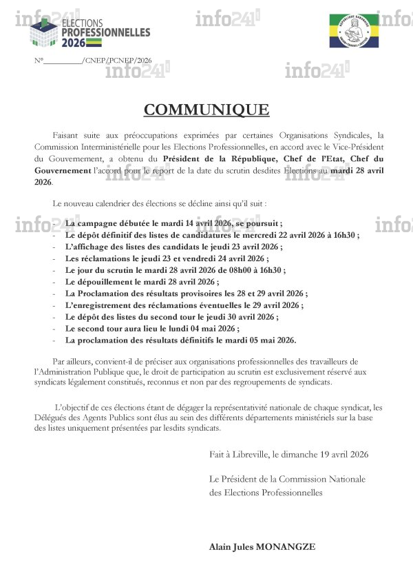 Les toutes premières élections professionnelles du Gabon prévues se tenir ce 22 avril, connaît un léger coup de frein. La Commission nationale des élections professionnelles (CNEP) a officiellement annoncé via un communiqué à Info241 le report du scrutin. Cette décision institutionnelle, actée le dimanche 19 avril par son président, Alain Jules Monangze, fait directement suite aux diverses préoccupations soulevées récemment par certaines organisations syndicales.