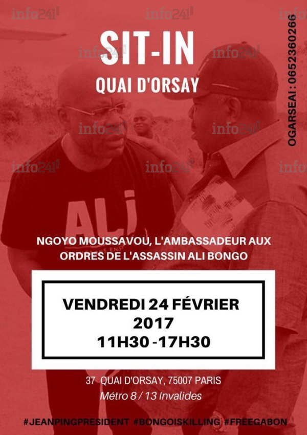 Pour les organisateurs qui réaliseront une action de contestation, le vendredi 24 Février 2017 au Quai d’Orsay de 12h à 17 heure de Paris : " il est temps que la diaspora Gabonaise de France et d’ailleurs s’invite à la cause diplomatique de notre pays. C’est notre droit. Ce vendredi, soyons nombreux devant le Ministère des Affaires Étrangères, 37 Quai d’Orsay Paris, de 11h30 à 17h30, pour dire « Non à la diplomatie mafieuse d’Ali Bongo. Car argue-t-il, le combat pour la libération du Gabon commence en France. Et on ne lâchera rien ».
