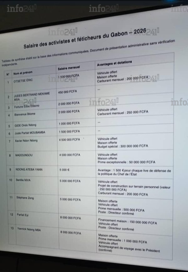 Loin de la rupture promise avec les méthodes de l’ère Ali Bongo, le nouveau pouvoir de Libreville semble avoir industrialisé le clientélisme numérique et mystique. La liste dévoilée intitulée « Salaire des activistes et féticheurs du Gabon - 2026 », détaille une grille de rémunération fastueuse destinée à récompenser ceux qui défendent le nouveau régime ou attaquent ses opposants sur les réseaux sociaux.