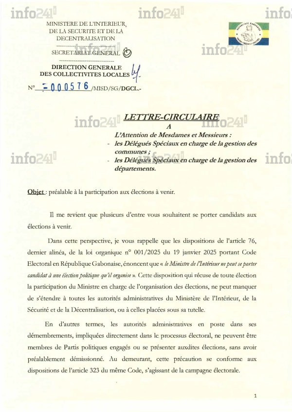 À moins de trois mois des élections municipales, départementales et législatives du 27 septembre, le ministre de l’Intérieur, Hermann Immongault, a adressé ce lundi 30 juin une circulaire sans ambiguïté à tous les délégués spéciaux en charge des communes et départements. « Il me revient que plusieurs d’entre vous souhaitent se porter candidats aux élections à venir », débute-t-il, avant de rappeler le cadre légal strict qui s’impose à tout agent administratif impliqué dans l’organisation du processus électoral.