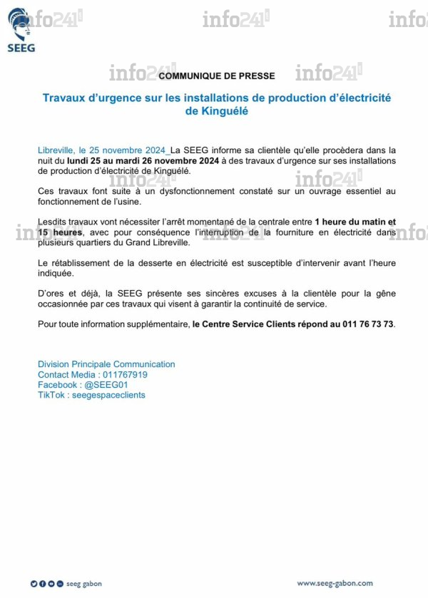 La Société d’énergie et d’eau du Gabon (SEEG) a annoncé ce lundi après-midi, la réalisation de travaux d’urgence dans la nuit de lundi à mardi suite à une avarie survenue sur ses installations de production d’électricité à Kinguélé. Cette situation imprévue, qui touche une infrastructure essentielle à la production d’électricité, va entraîner une interruption temporaire de la fourniture d’électricité dans plusieurs quartiers du Grand Libreville, une coupure entre 1 heure à 15 heures ce mardi.