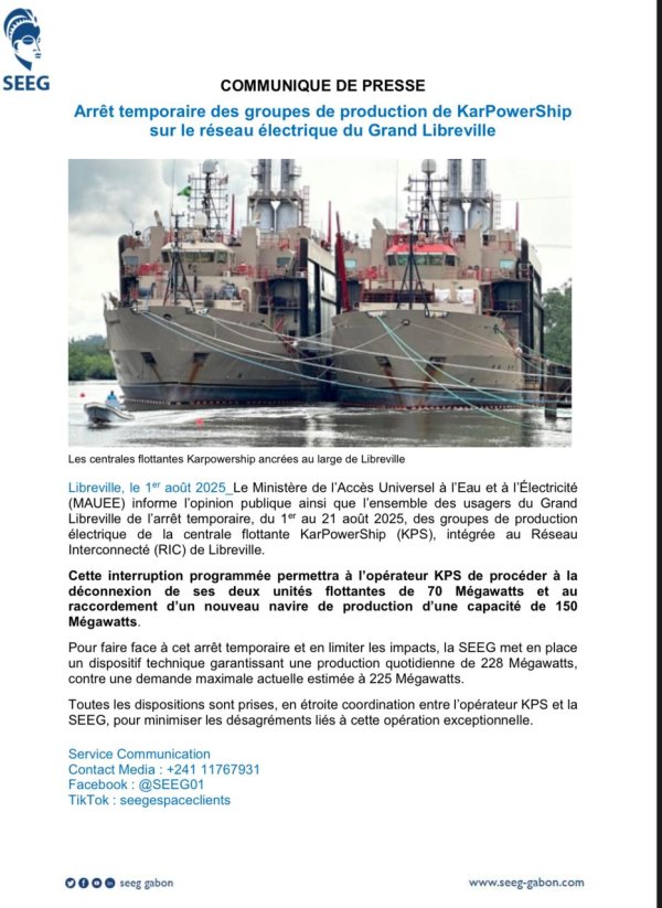 Selon les autorités, cette opération devrait se dérouler sans conséquence majeure pour les usagers. La SEEG, en étroite coordination avec KarPowerShip, affirme avoir mis en place un dispositif technique permettant de maintenir une production journalière de 228 mégawatts, proche de la demande maximale actuelle estimée à 225 mégawatts. L’ensemble de la manœuvre s’inscrit dans une volonté d’apporter davantage de stabilité et de sécurité à l’approvisionnement en électricité de la région.