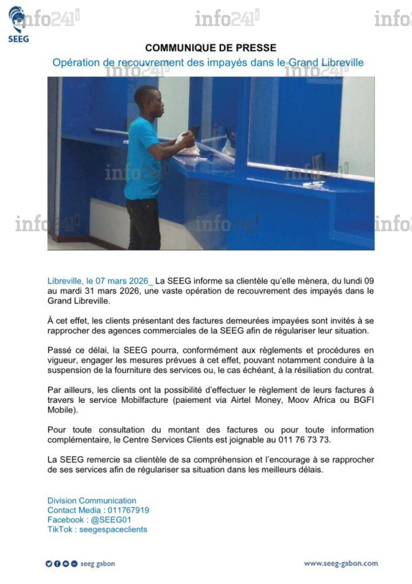 Pour le périmètre spécifique du Grand Libreville, la SEEG informe sa clientèle qu’elle mènera, du lundi 9 au mardi 31 mars, une vaste opération de recouvrement des impayés. L’objectif est clair : contraindre les abonnés présentant des arriérés de paiement à se rapprocher des agences commerciales pour solder leurs comptes. Le communiqué précise que « passé ce délai, la SEEG pourra, conformément aux règlements et procédures en vigueur, engager les mesures prévues à cet effet ».