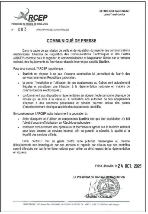 L’ARCEP constate « la commercialisation et l’exploitation illicites des équipements du fournisseur d’accès Internet par satellite Starlink » et rappelle que le service « ne dispose à ce jour d’aucune autorisation lui permettant de fournir des services Internet en République gabonaise ». En conséquence, toute installation, utilisation ou vente du matériel est désormais considérée comme illégale et passible de sanctions pécuniaires et pénales, incluant la saisie des équipements.