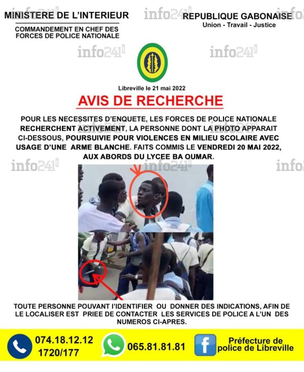 Selon l’avis de recherche lancé par la police, ce jeune élève est d’ores et déjà poursuivi pour « violences en milieu scolaire avec usage d’une arme blanche ». D’où l’appel de la préfecture de police qui prie « toute personne pouvant l’identifier ou donner des indications afin de le localiser » de contacter les services de police de la capitale gabonaise.