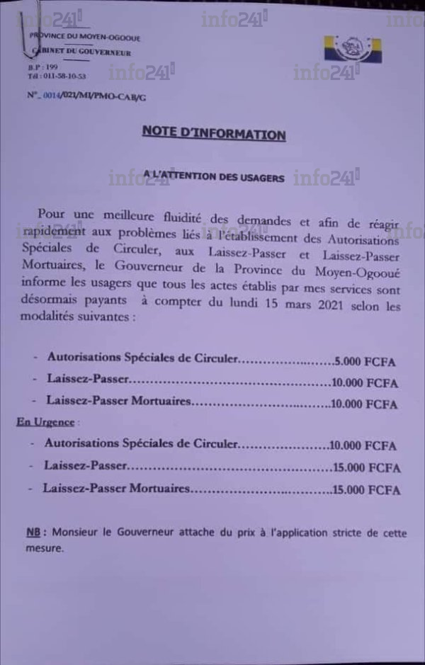 « Faisant suite à la Note d’information N°0014/021/MI/PMO-CAB/G du 11 mars 2021 signée du Gouverneur de la province du Moyen-Ogooué, Le Secrétaire Général du Ministère de l’Intérieur sur instructions du Ministre d’Etat, rappelle à toutes fins utiles qu’en application du principe de gratuité du service public, tous les actes délivrés dans le cadre de la gestion de la crise sanitaire de la Covid-19,autorisant les déplacements à titre exceptionnel des populations, sont gratuits », a fait savoir la secrétaire générale du ministère de tutelle Judith Koumba Pemba Mombo.