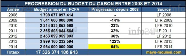 Progression du budget de la Présidence du Gabon entre 2008 et 2014