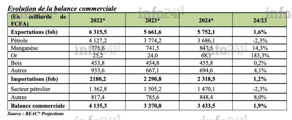 Le Gabon a clôturé l’année 2024 avec un excédent commercial de 3 433,5 milliards de FCFA, en progression de 1,9 % par rapport aux 3 370,8 milliards de FCFA enregistrés en 2023, selon la dernière note économique de la Banque des États de l’Afrique centrale (BEAC) citée mardi par l’AGP.