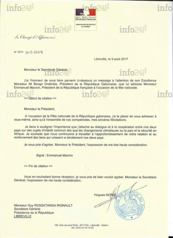 En effet, Emanuel Macron par l’entremise de son ambassadeur a adressé le message suivant : « A l’ occasion de la Fête nationale de la République gabonaise, j’ai le plaisir de vous adresser à vous-même, ainsi qu’à l’ensemble de vos compatriotes, mes sincères félicitations. Je tiens à souligner l’importance que j’attache au dialogue et à la coopération entre nos deux pays sur des sujets d’intérêt commun tels que les changements climatiques ou la paix et la sécurité en Afrique. Je souhaite que nous continuions à travailler à l’approfondissement de notre relation et au renforcement des liens qui unissent si étroitement nos deux pays. Je vous prie d’agréer, Monsieur le Président, l’expression de ma très haute considération ». Cet usage répond à la pratique diplomatique traditionnelle. Pas de quoi y voir une consécration ou des félicitations assumées à l’élection controversée amplifiés d’une tricherie grossière et des violations des droits humains perpétrées par Ali Bongo et son régime. Comme on a pu le lire dans les colonnes de certains médias proches du régime despotique de Libreville, relayé sur les réseaux sociaux par leurs avatars et soutiens.