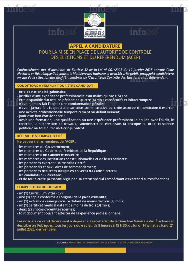 Le communiqué fixe enfin les modalités de dépôt des candidatures. Les intéressés devront soumettre leur dossier « au Secrétariat de la Direction Générale des Élections et des Libertés Publiques, tous les jours ouvrables, de 8 heures à 15 h 30, du lundi 14 juillet au lundi 21 juillet 2025, dernier délai ».