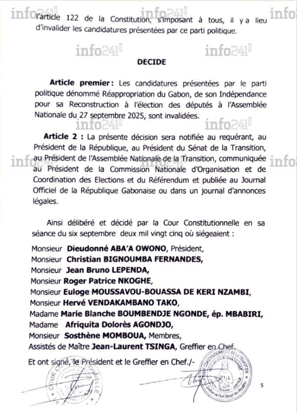 Avec cette invalidation, tous les candidats REAGIR sont exclus de la course aux législatives et aux locales. La Cour a rappelé le caractère contraignant de ses décisions, précisant que celles-ci sont sans appel et seront publiées au Journal officiel. L’article premier de la décision stipule : « La candidature de Monsieur François Ndong Obiang, candidat du parti politique dénommé Réappropriation du Gabon, de son Indépendance pour sa Reconstruction à l’élection des députés à l’Assemblée nationale du 27 septembre 2025, au deuxième siège du deuxième arrondissement de la commune de Libreville, province de l’Estuaire, est invalidée ».