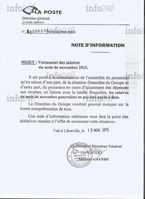 En effet, une note du nouveau Président directeur général daté du 19 novembre prévenait que « les salaires du mois de novembre pourraient ne pas être payés à temps ». Ce qui a provoqué lyre des employés réunis en assemblée générale extraordinaire organisée par le Syndicat national de la poste (Synaposte).