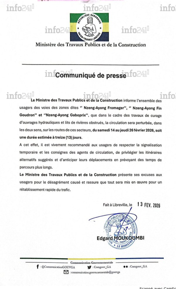 Le ministère gabonais des Travaux publics et de la Construction a annoncé ce vendredi une perturbation de la circulation routière dans plusieurs secteurs de Nzeng-Ayong, dans le 6e arrondissement de Libreville. La mesure concerne les zones dites « Nzeng-Ayong Fromager », « Nzeng-Ayong Fin Goudron » et « Nzeng-Ayong Gaboprix » dès ce samedi 14 février. Les usagers sont appelés à adapter leurs déplacements dès l’entrée en vigueur du dispositif.