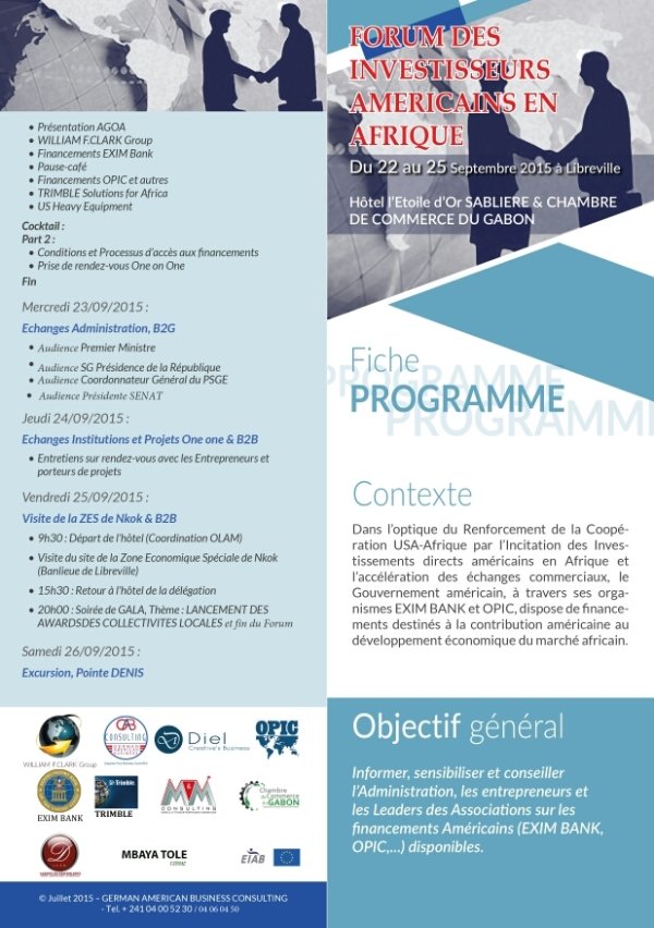 Le forum se déroulera à la Chambre du commerce de Libreville. Il aura pour objet de faire la promotion des investissements américains en direction du continent africain. Durant trois jours, les participants vont échanger et nouer des partenariats techniques et financiers dans le but d’accéder au marché de crédit des USA.