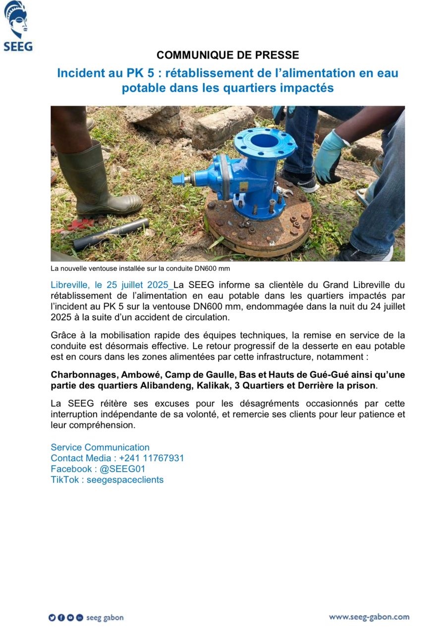 Dans un communiqué, la SEEG a indiqué que ses équipes techniques ont été mobilisées dès les premières heures de vendredi pour réparer la conduite DN600 mm endommagée. Les opérations ont nécessité la mise en place de moyens spéciaux pour dégager la zone et remplacer la ventouse détruite. « Nous présentons nos excuses à la clientèle pour les désagréments subis », a indiqué la société, avant d’appeler les automobilistes à plus de vigilance autour de ses installations sensibles.