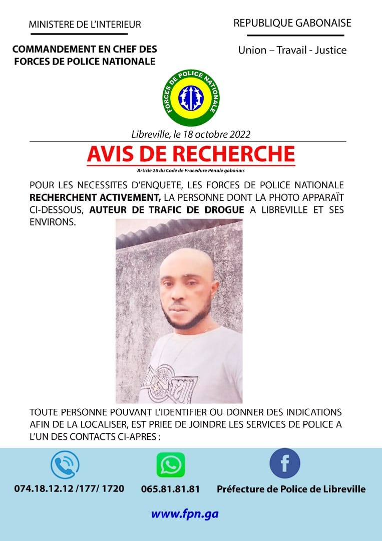 Le phénomène du trafic et de consommation de drogues au Gabon préoccupe plus d’un. Les trafiquants réussissent très souvent à passer entre les mailles du filet. C’est du moins encore le cas pour ce jeune compatriote, la trentaine d’années révolue, qui fait depuis ce mardi après-midi, l’objet d’un avis de recherche lancé à son encontre par less forces de police nationale.