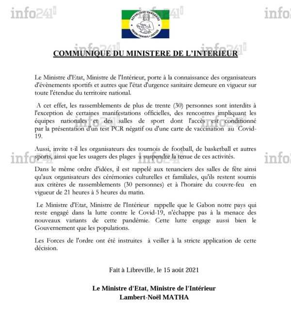 Pour que les choses soient bien claires, le ministère de l’Intérieur « invite t-il les organisateurs des tournois de football, de basketball et autres sports, ainsi que les usagers des plages à suspendre la tenue de ces activités », conclu le communiqué officiel parvenu hier à la rédaction d’Info241. Une communication qui ne vise pas que ces acteurs. Les mariages et autres manifestations estivales sont aussi sur le tableau de chasse des autorités.